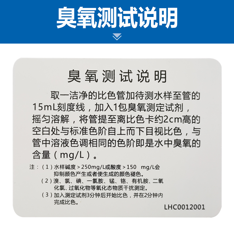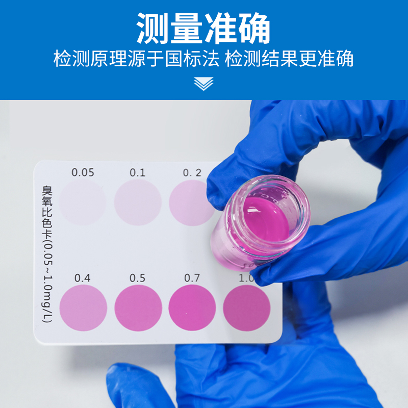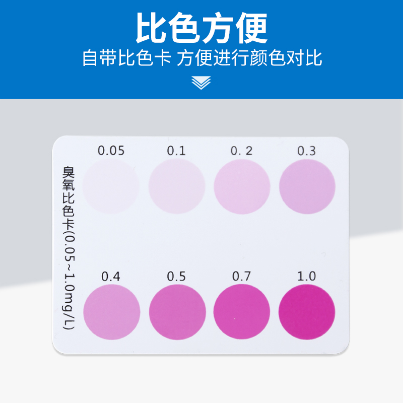 取一洁净的比色管加待测水样至管的刻度线(15mL),加入一包臭氧测定试剂,摇动至完全溶解后,将管提至离比色卡约2厘米高的空白处与标准色阶至上而下目视比色,与管中溶液色调相同的色阶即是水中臭氧的含量(毫克/升)。