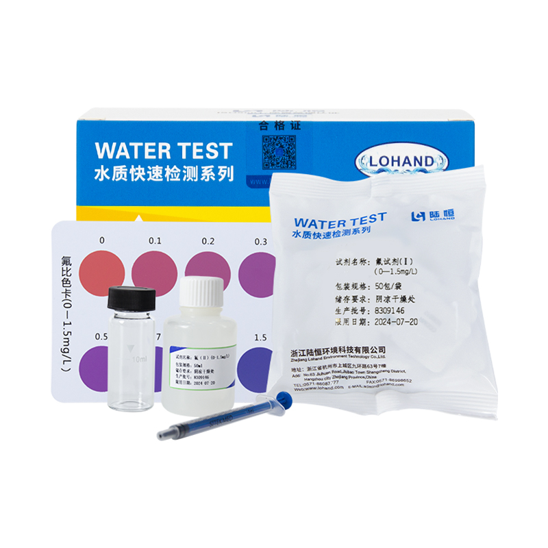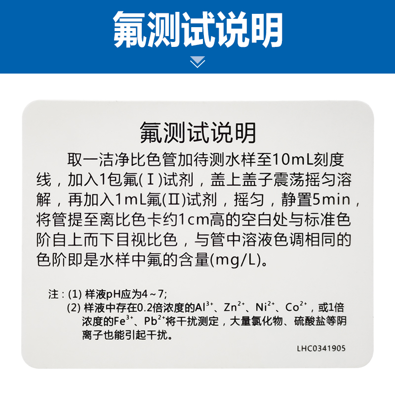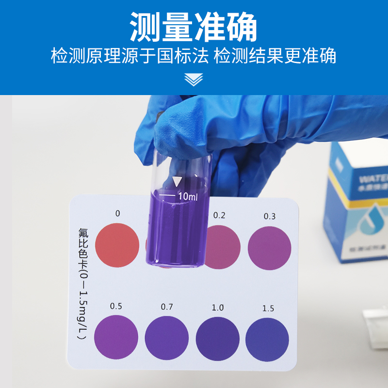 取一洁净的比色管加待测水样至管的刻度线(10mL),加入一包氟试剂(I),摇动至完全溶解,再加入1mL氟试剂(II),摇动至完全溶解,放置5min后,将管提至离比色卡约2厘米高的空白处与标准色阶至上而下目视比色,与管中溶液色调相同的色阶即是水中氟的含量(毫克/升)。
